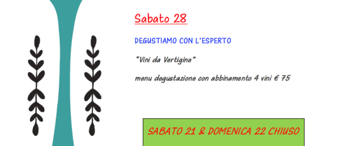 Sabato 14I SAPORI DEL MARE incontrano i vini dell’Alto Adige, Menu a base di pesce con abbinamento vini selezionati dal nostro sommelier € 70 solo menù € 55Sabato 28DEGUSTIAMO CON L’ESPERTO “Vini da Vertigine” menu degustazione con abbinamento 4 vini € 75 APERTI A PRANZO DOMENICA 1 – 8- 15-29 …
